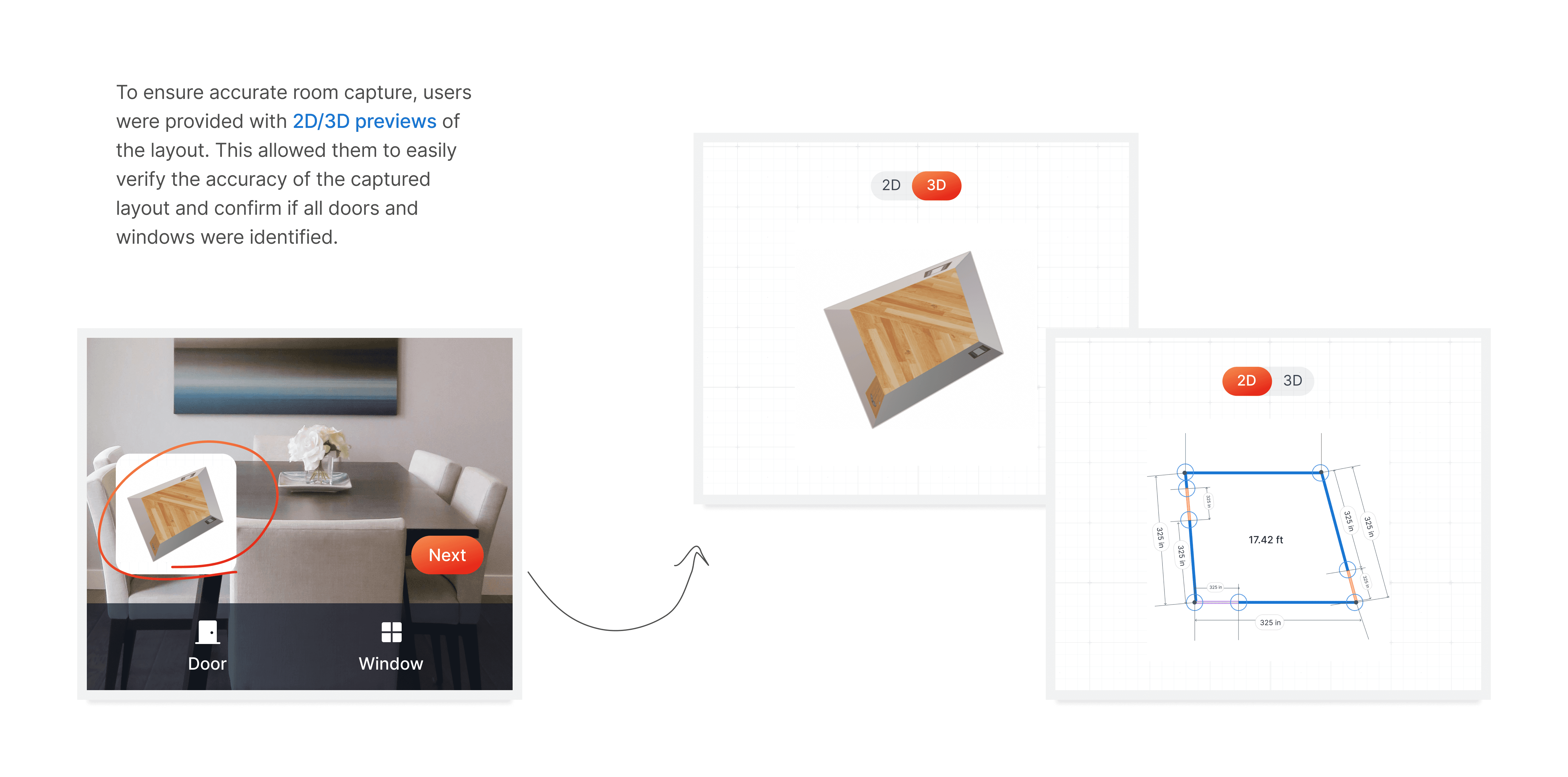 Homeowners were guided to capture walls and ceilings, generating 2D/3D sketches of the space. A video recording feature allowed contractors to go back and review any missed details.